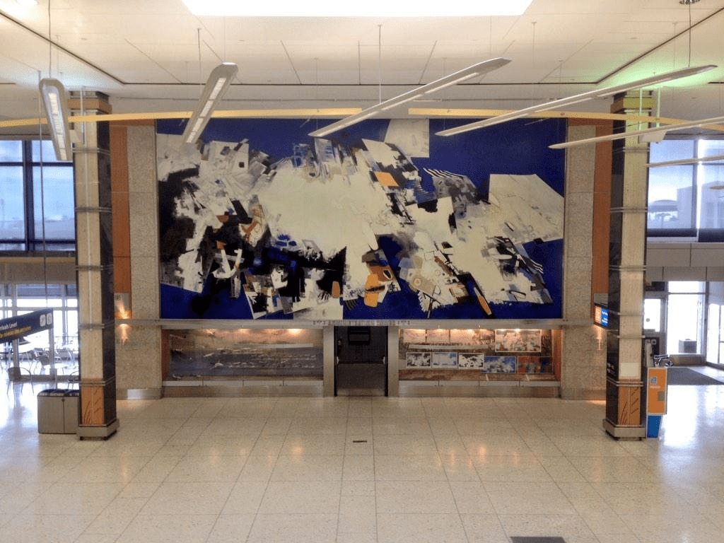 В 1963 году был построен пассажирский терминал. Он был построен в международном стиле. Это такой архитектурный стиль, определяемый соблюдением функционального и утилитарного дизайна, а также минимализма. Зону вылета украшали произведения искусств, в том числе большая фреска «Пилот Буша в северном небе», заказанная канадским правительством в 1963 году за 18 000 долларов США. По состоянию на 2005 год эта фреска обошлась уже в 750 000 долларов. В настоящее время этот терминал используется как Северный терминал.